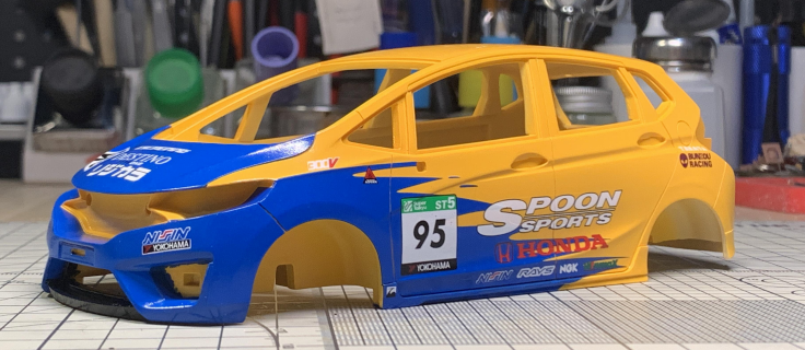After sticking all the water stickers, you can spray the amino varnish. Here l choose Parrot(BASF) 666 varnish. Because there are a lot of water stickers on the car body, the varnishshould be sprayed more than plain car to increase the thickness. Here I choose to stopspraying 4 layers of wet paint, and then wait for 3-5 days to completely cure and polish. Sofar, the main part of the car shell has been completed.