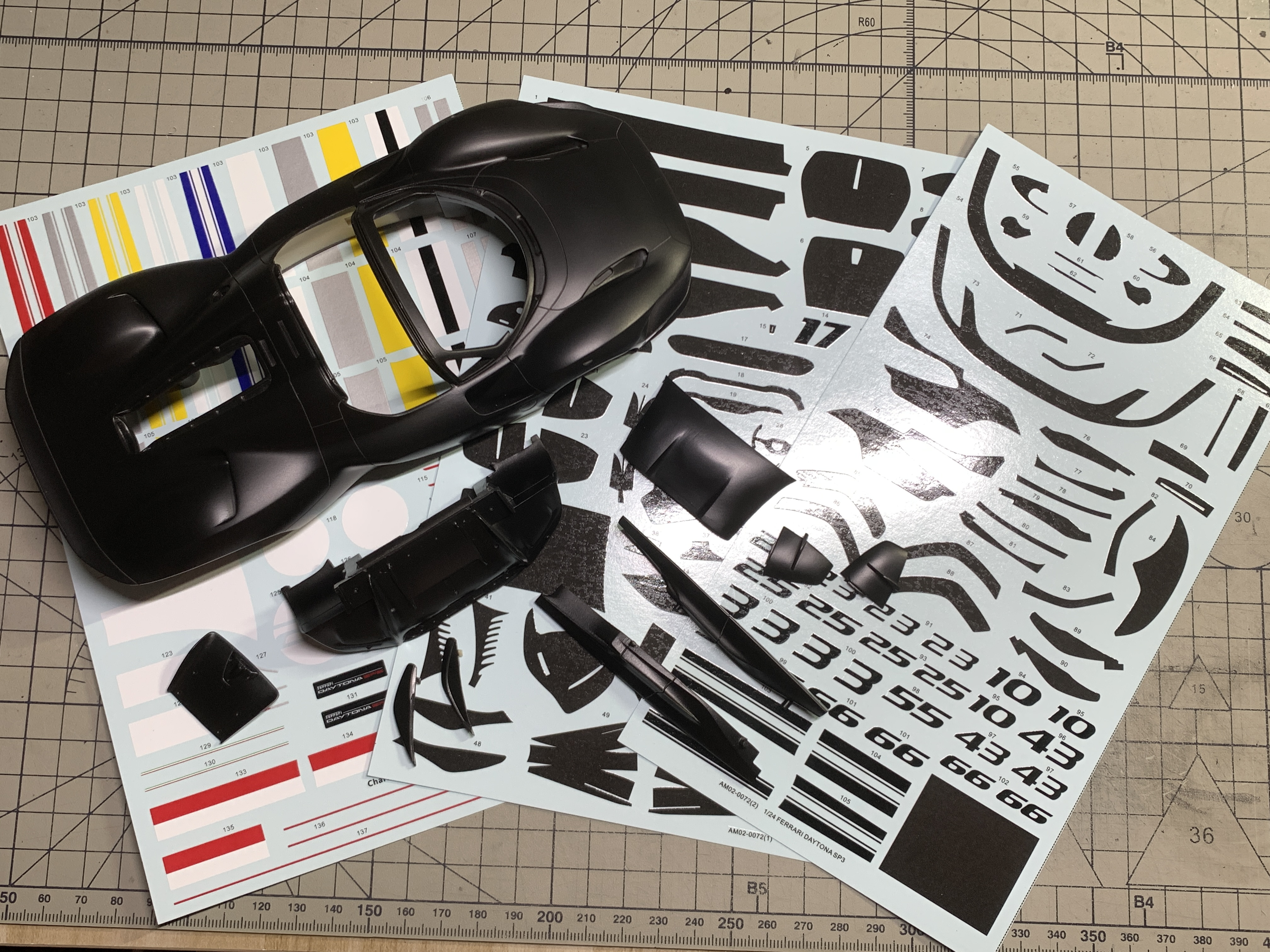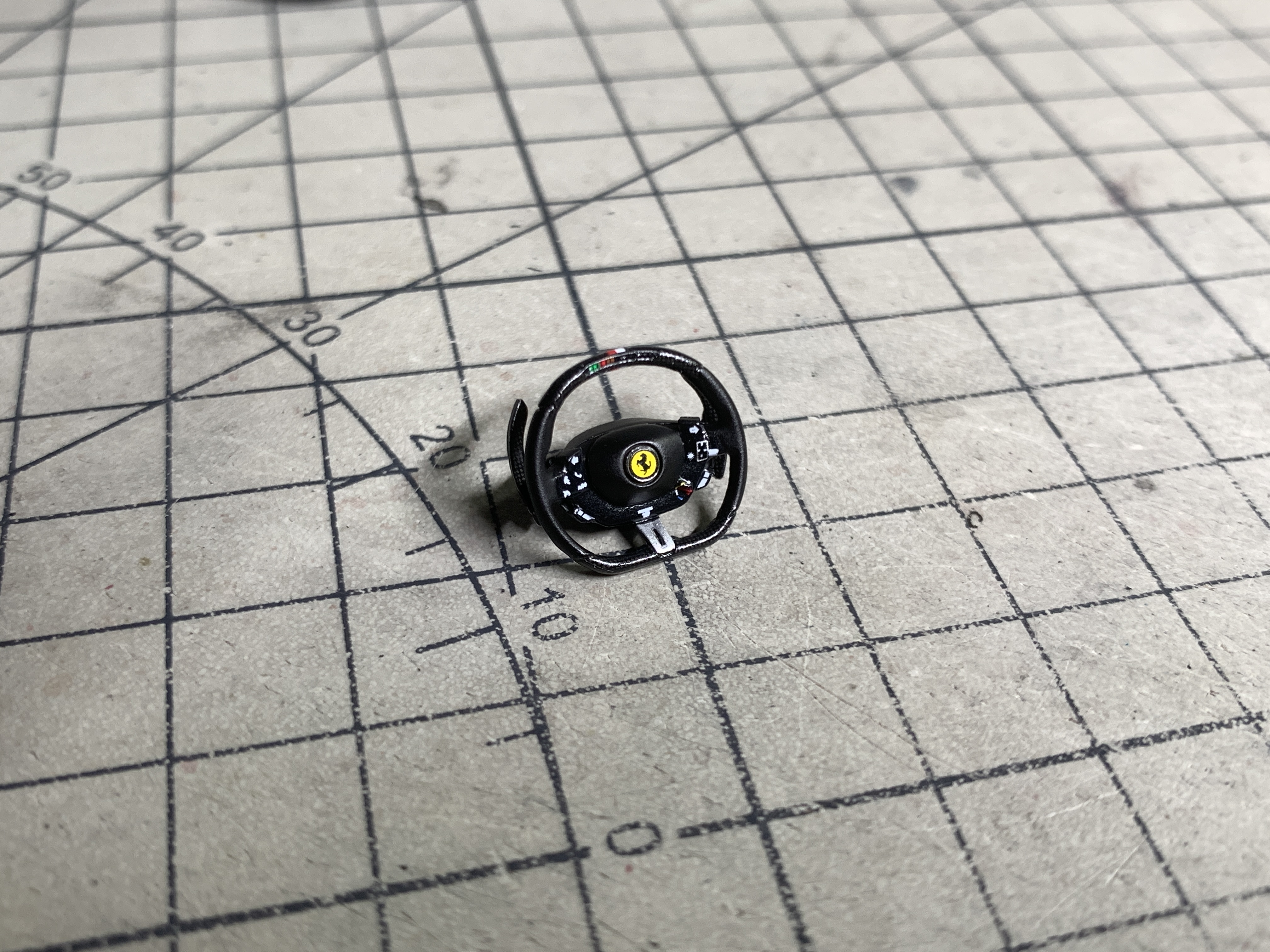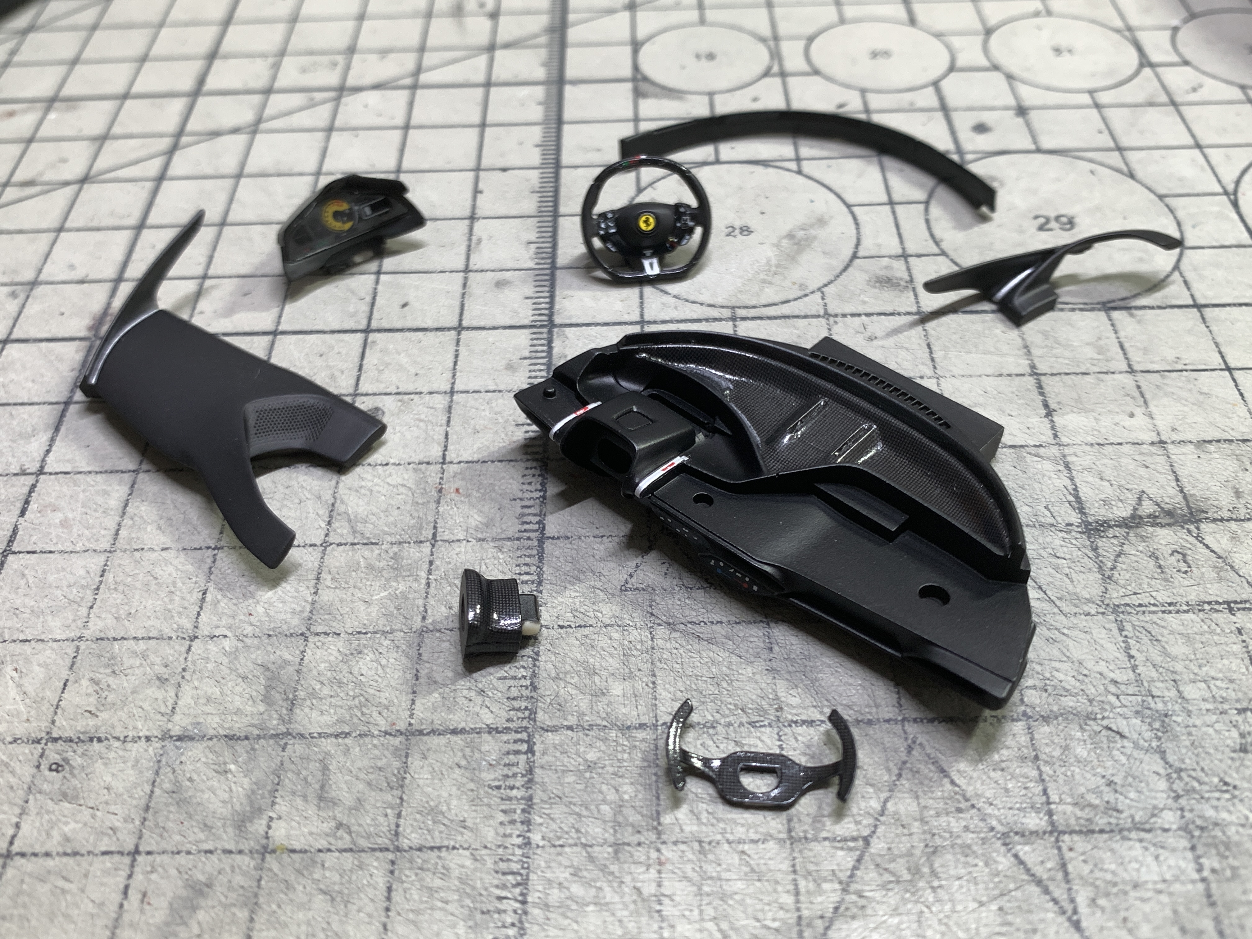Complete all detail painting and decal work on the steering wheel and center console before assembly.